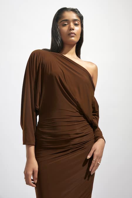 Brown dress in malai lycra featuring an asymmetric neck and gathered detailing