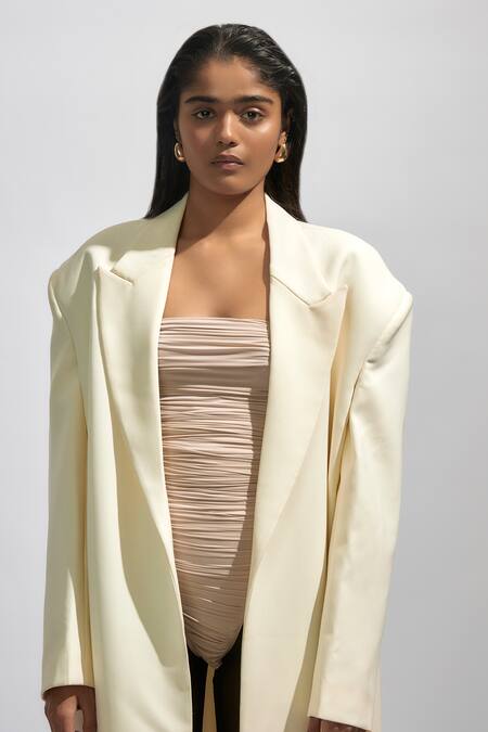 Off White Lycra Solid Lapel Collared Trench Coat