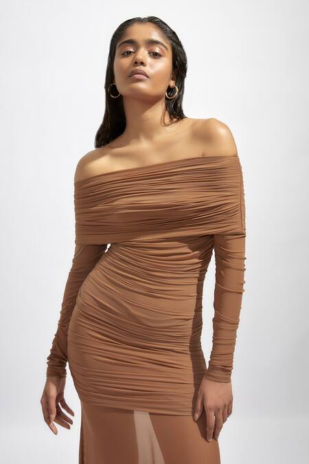 Beige off-shoulder dress featuring ruched detailing and a draped silhouette