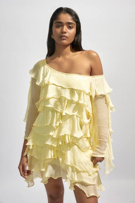 Butter yellow chiffon one-shoulder dress featuring asymmetric ruffled detailing