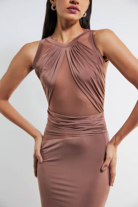 Pink Net, Lycra Boat Neck Tammy Ruched Gown