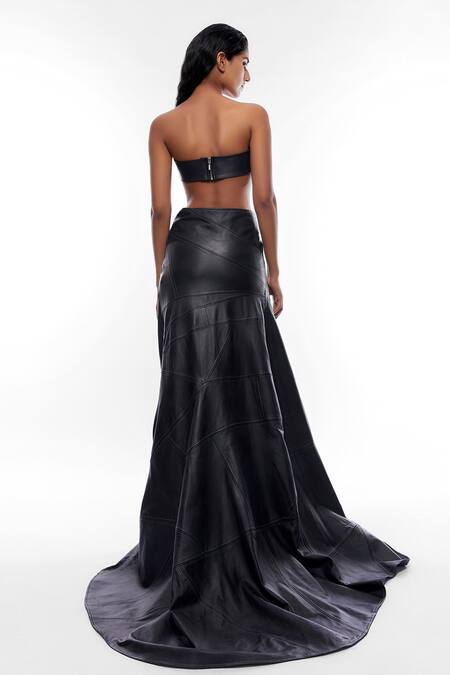 Black leather crop top featuring a straight neckline with 3D flower embellishment. Paired with a fit and flare long skirt with a side zip closure.