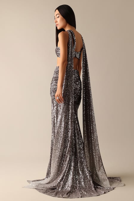 Grey Net Sequins, Beads Halter Neck Alida Embroidered Blouse Skirt Set