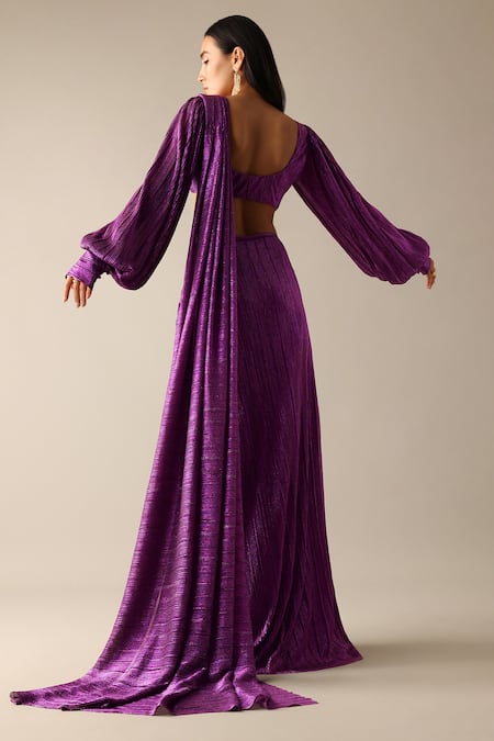 Purple pre-pleated saree crafted in shimmer lycra featuring a deep V neck blouse. The ensemble includes puffed sleeves and a back hook closure for the blouse.