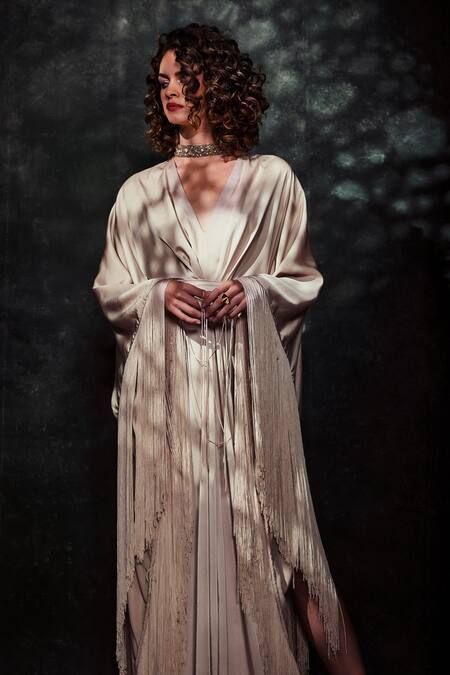 Pink kaftan with V-neckline, pearl, cutdana embroidery & fringe borders.
