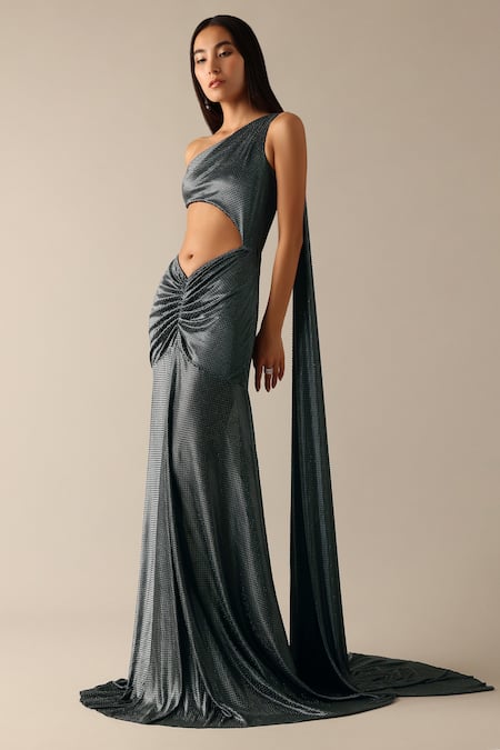 Attached drape detail, Side cut-out design, Rhinestones embellishment