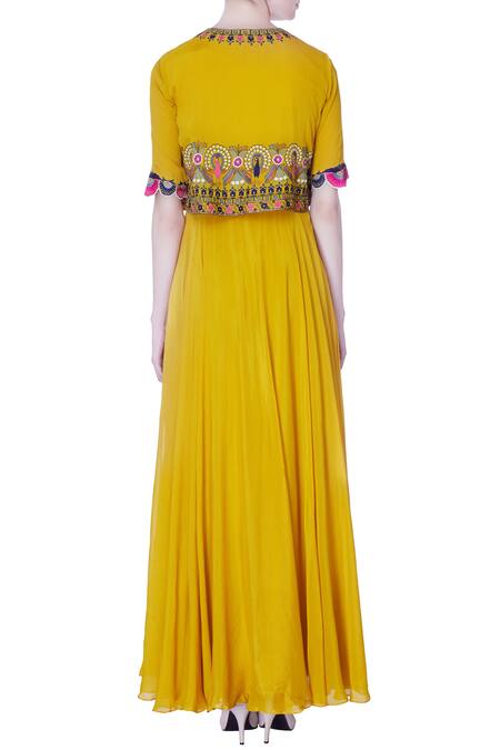 A yellow chiffon tunic features a top layer in sequin aari work and multicolored embroidered peacock motifs.
