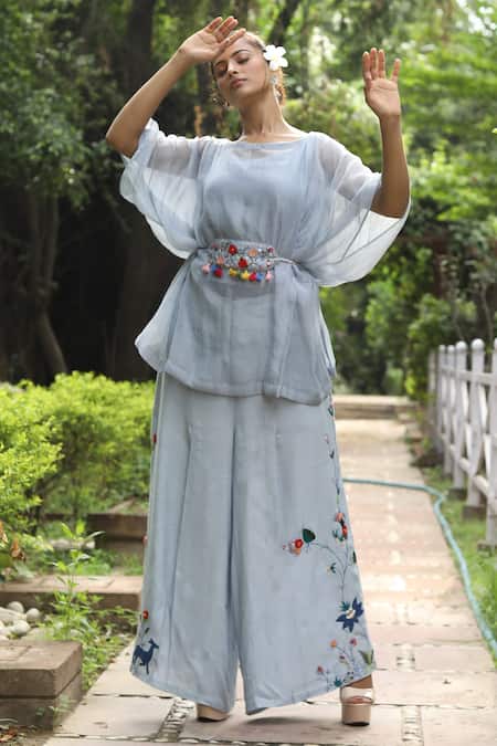 Ice blue kaftan style top featuring batwing sleeves and round neckline. Paired with pants adorned with deer and duck embroidery, embellished with patches and beads.