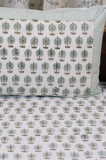 Off white cotton double bedsheet with all-over palm tree block print. Comes with two pillow covers.