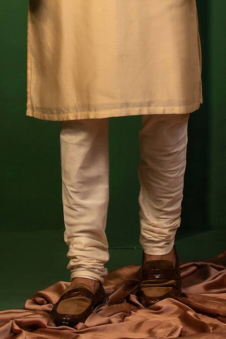 Cream kurta featuring full sleeves and a Mandarin neckline with placement mirror embroidery. Paired with a plain churidar for a complete look.
