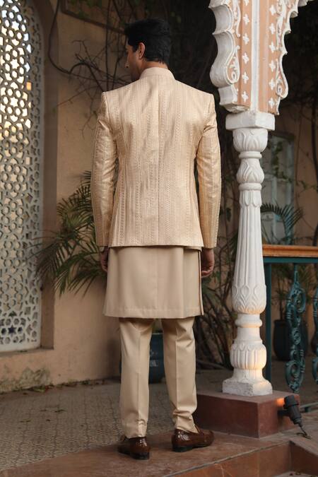 Beige kurta featuring front golden buttons and a mandarin neckline. Paired with a jacket adorned with all-over thread embroidery and plain pants.