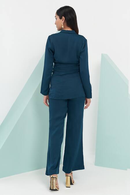 Sea green satin crepe wrap jacket with shawl collar & side gathered draped details. Paired with boot cut trousers with side pockets.