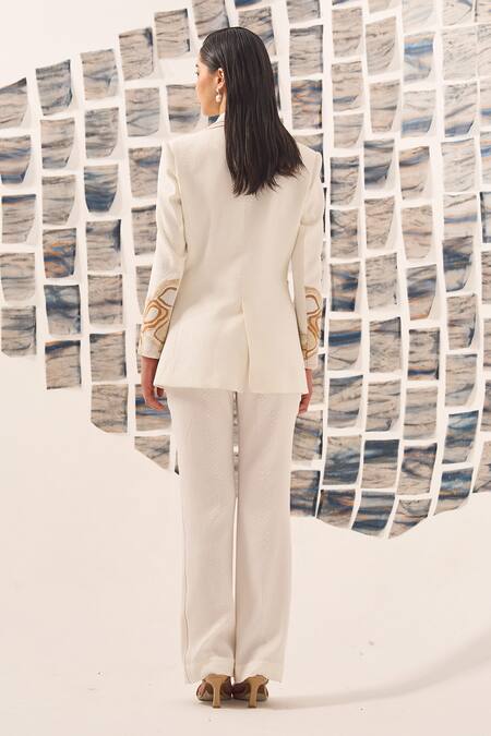White blazer in a textured base fabric with bead embellishments. Comes with matching pant.