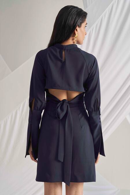 Midnight blue dress with waist cutout and a beautiful tie-up, buttoned extra-long cuffs and the button details on reglan sleeve and ben neck.