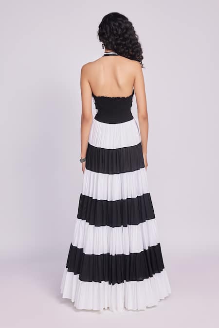 Black Cotton Halter Neck And White Striped Maxi Dress