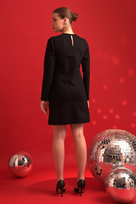 Black dress featuring long sleeves and a butterfly embellishment on the front