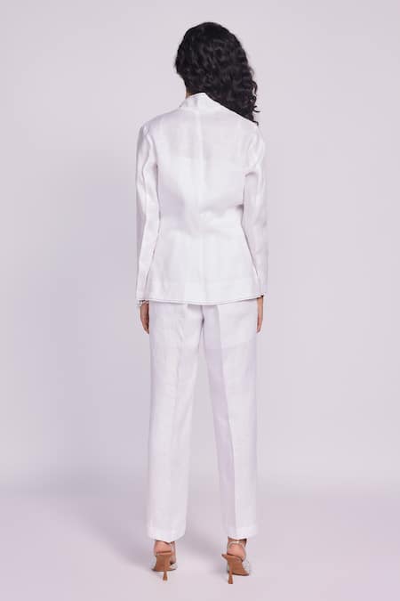 Contrasting stitch detailing along the jacket edges., Belted waist for adjustable fit.