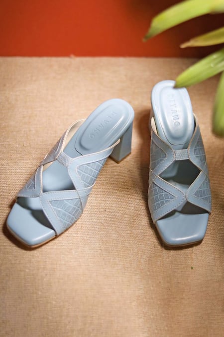 Blue double cross slipon heels featuring a textured pattern on the strap and cutwork in the center