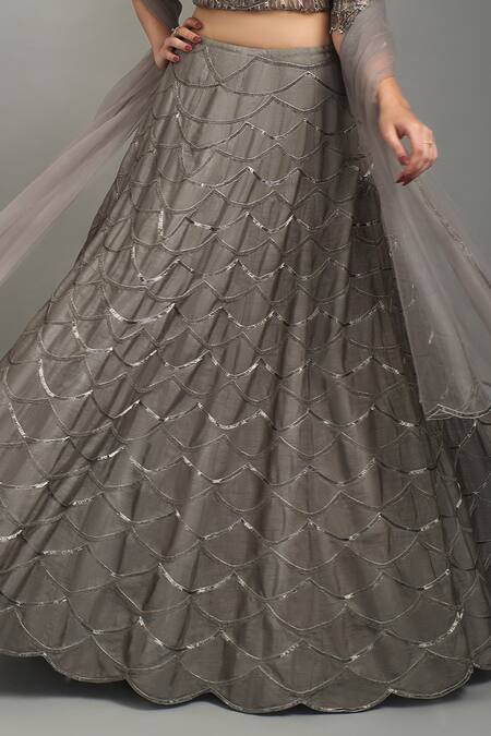 Grey Dupion Silk V Neck Embellished Lehenga Set