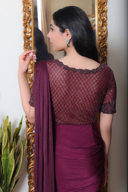 Wine pre-draped saree gown. Paired with an attached embellished blouse and tassel detailed pallu.