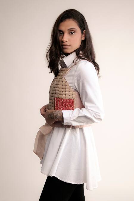 Beige vest style crop top with eco-friendly leather geometric, floral applique motifs & organza front tie-up.