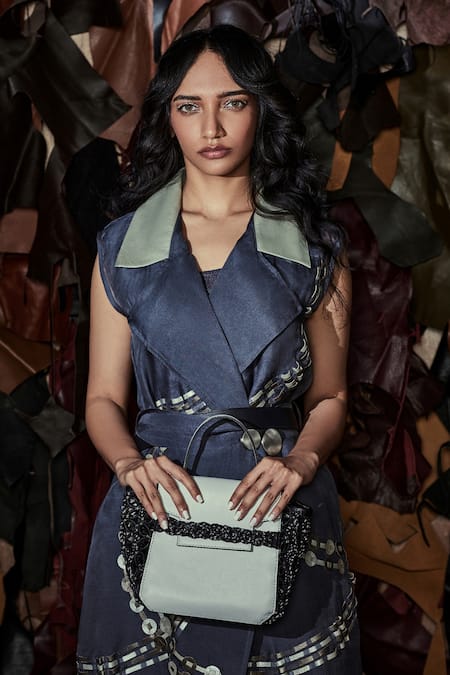 Dark grey sleeveless trench dress in embroidered leather work and contrast collar. Comes with organza belt and slip.