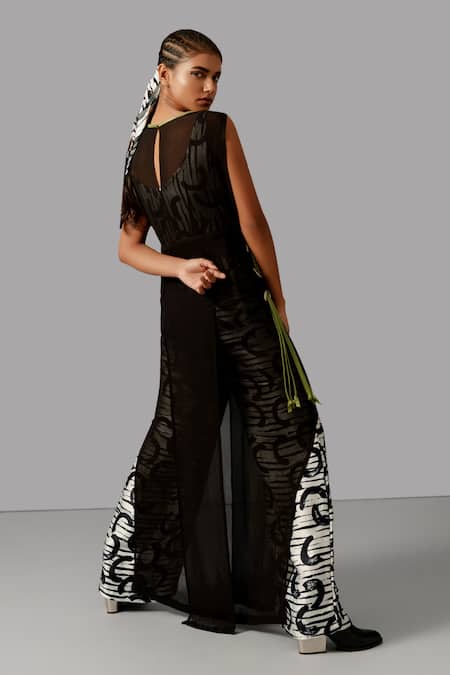Black satin crop top with U neck and all-over geometric print. Paired with a black georgette overlay featuring cut work asymmetric hem and palazzo pant.