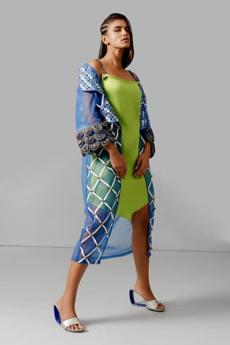Blue kimono jacket made from tulle featuring a geometric pattern and leather placket