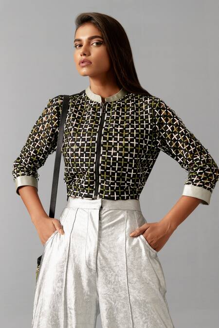 Black Crepe, Tulle Bandeau Neck Checkered Pattern Woven Bomber Jacket