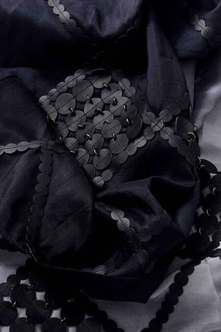 Grey silk stole featuring a circular grid-like pattern made of leather with metal rings