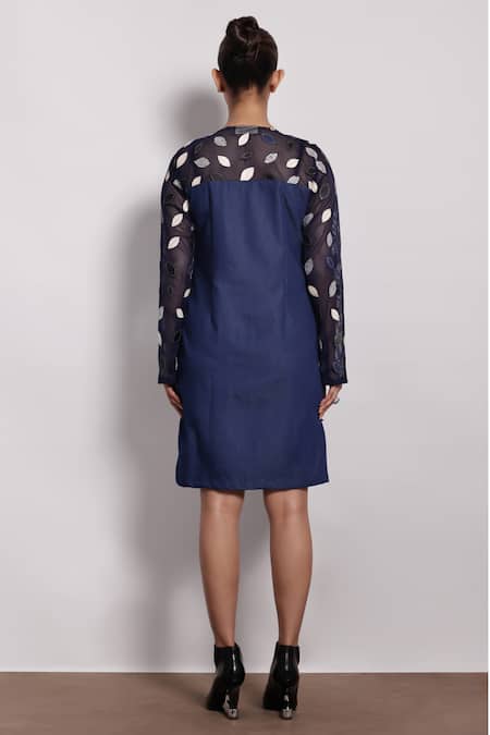 Blue denim dress featuring leather applique cutwork embroidery and mesh detailing on sleeves