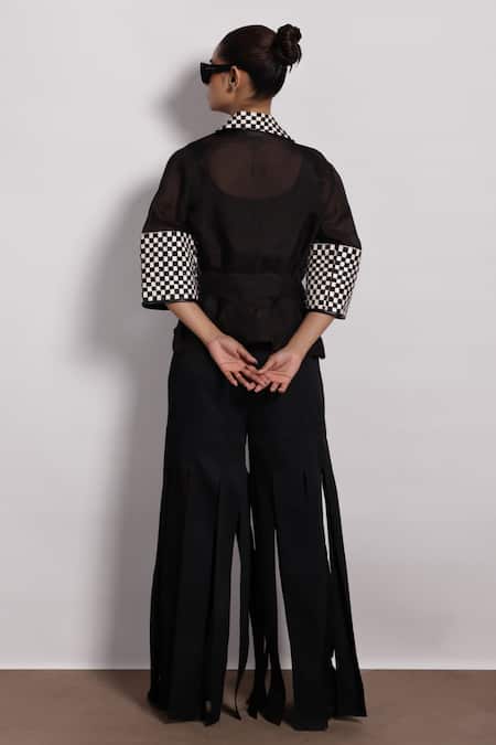 Lasercut monochrome woven motifs on sleeves and body., Checkered pattern detailing on cuffs.