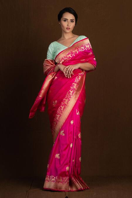 Fuchsia pink pure katan silk handloom banarasi saree in floral & animal pattern.