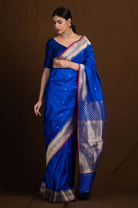 Blue pure katan silk handloom banarasi saree in floral pattern & contrast border.