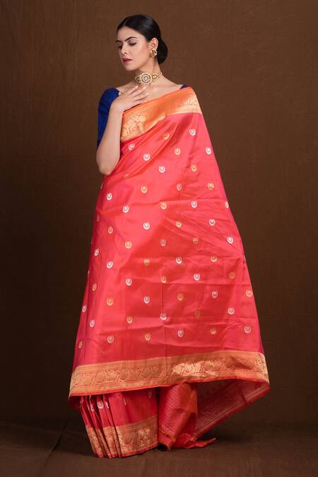 Orange pink banarasi saree with sona rupa chand tara booti.
