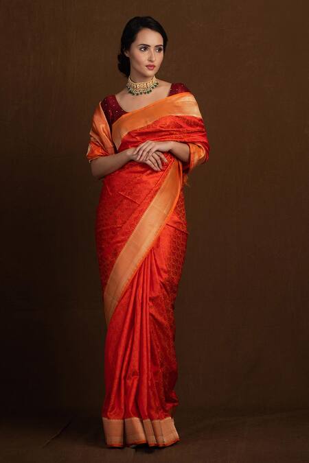 Orange banarasi saree with floral woven pattern & geometric border.