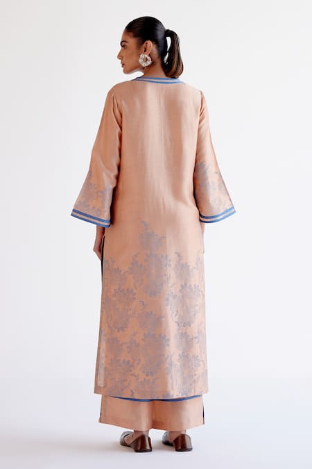 Brown Tussar, Silk Embroidery V-neck Caramel Printed Kurta Set