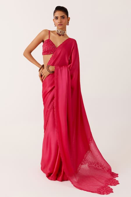 Fuchsia saree featuring zari thread embroidered cutwork border. Paired with a satin padded bralette blouse.