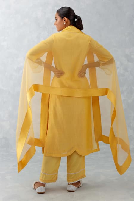 Yellow Silk Organza, Silk, Chanderi Dori And Pittan Floral Work Kurta Pant Set