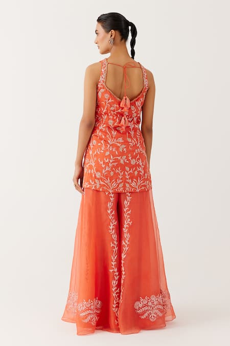 Orange kurta featuring dori and sequin embroidery with a V neck and sleeveless design. Paired with a coordinating sharara and dupatta, enhancing the overall ensemble.