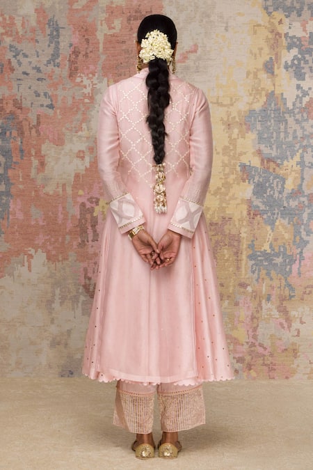 Pink organza jacket with floral embroidered motifs & front tassel tie-up. Paired with Chanderi sleeves, mukaish work anarkali & Chanderi pant, organza dupatta.