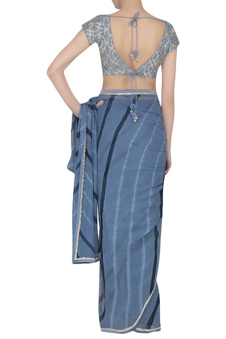 This leheriya saree in blue tops our list of festive closet champions. It comes with a sequin embroidered border. The blouse flaunts all over gota patti, sequin and bead embroidery in jaal pattern.