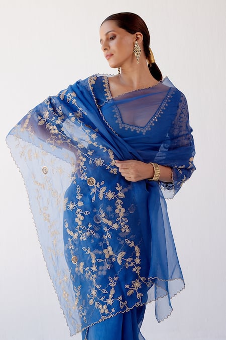 Blue Silk Organza And Chanderi Dori, Sequin Blunt V Embroidered Saree With Blouse