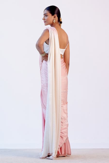 Ombre blush pink saree with resham and pearl embroidery. Paired with sleeveless gajji silk embroidered ivory blouse.