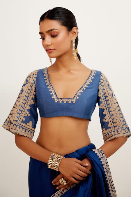 Blue saree features dori embroidery on the border on silk satin base. Paired with a matching long sleeved chanderi blouse, highlighted with delicate dori embroidery on square neckline and cutwork sleeves.