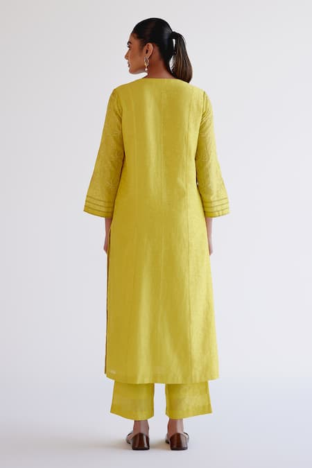 Yellow , Chanderi, Organza Embroidery Keyhole Neck Kurta Set