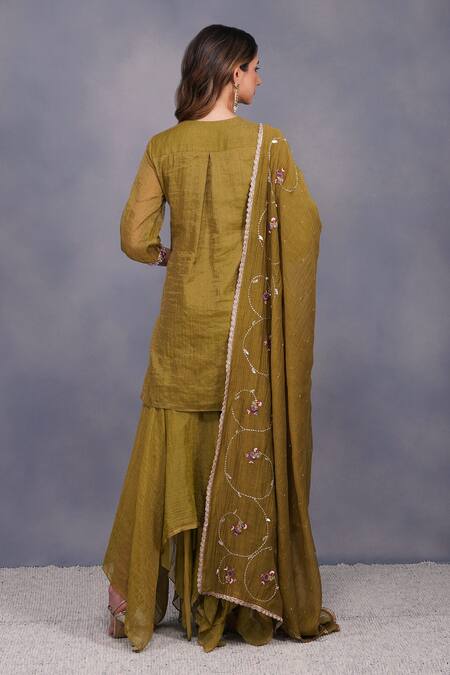Pickle green rustic style asymmetrical gharara and tissue kurta adorned with sequins highlighted on printed yoke. Paired with a embellished dupatta in baroque inspired thread and sequins in dramatic curvaceous style.