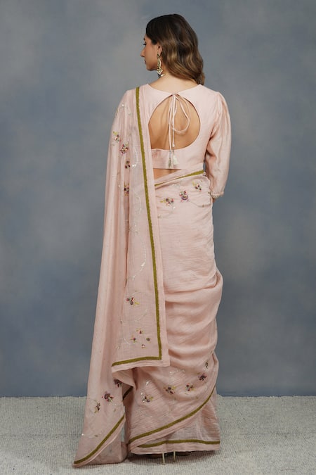 Clay rose chanderi saree with contrast cotton lace finishes, embellished with baroque inspired thread and sequins work in dramatic curvaceous style. It comes with an unstitched blouse piece.