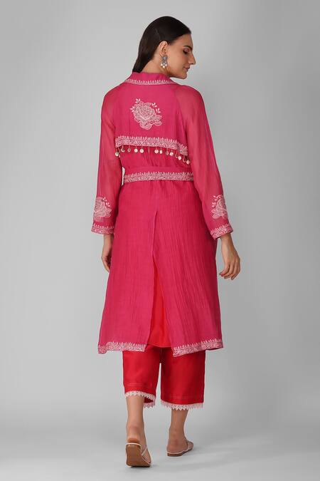 Magenta trench jacket featuring thread and sequin floral embroidery. Paired with a contrasting red kurta and pant with lace embroidered hem.