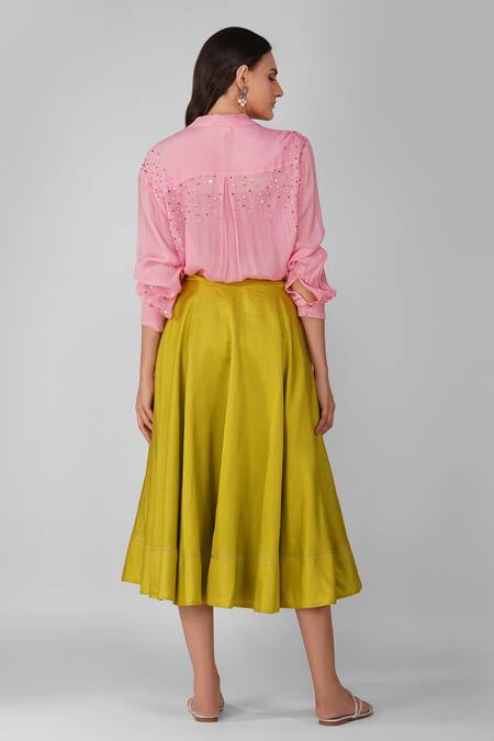 Magenta crop top featuring thread and sequin floral embroidery with a sweetheart neckline. Paired with a green circular skirt adorned with coin tassels.
